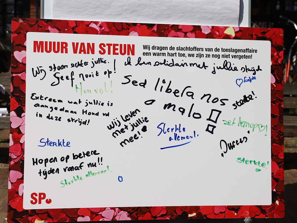 ‘Volhouden’ en ‘Sed libara nos a malo’ (Verlos ons van het kwaad, red.) zijn enkele van de hartenkreten die zaterdagmorgen met viltstift op het bord werden geschreven door passanten op het Rheineplein. Het bord moet een onderdeel gaan vormen van de ‘Muur van steun’ voor slachtoffers van de toeslagenaffaire, die ergens in september bij de Tweede Kamer zal worden geplaatst. De Muur van steun is een actie van de SP, een symbolisch appel aan de beleidsmakers én tegelijkertijd een signaal dat de partij de vele slachtoffers nog steeds niet vergeten is.