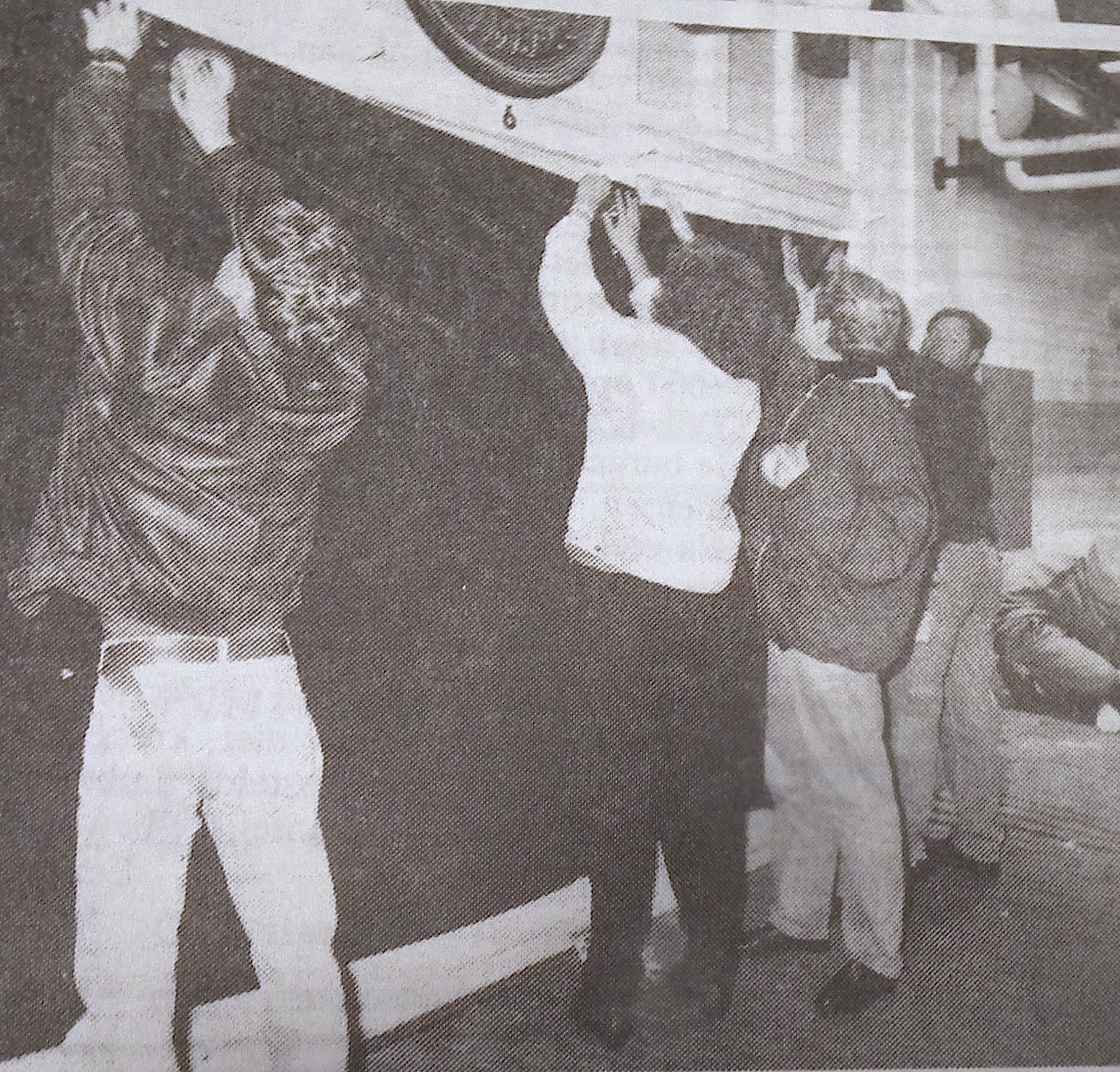 Bij de foto's (van boven naar beneden): 1., 2. en 4. Winkeliers demonstreerden tegen betaald parkeren door hun etalages met zwart plastic af te dekken. 3. burgemeester M. Vunderink, M. Reesink en W. Smies; 5. Daags na opschorting werd de apparatuur in het centrum afgedekt