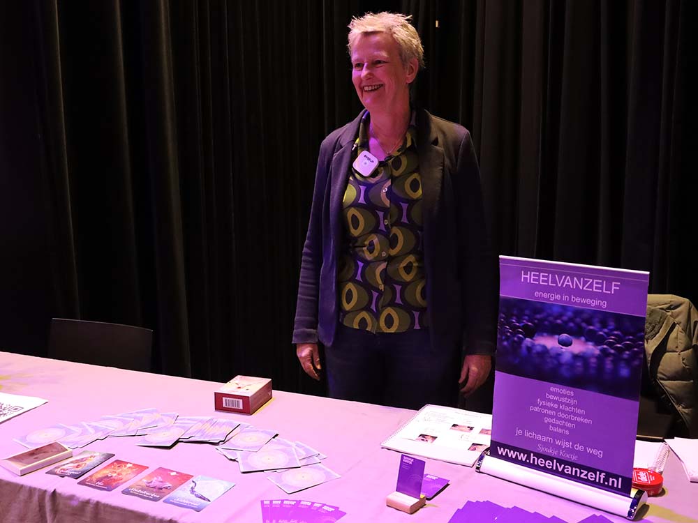 Zo stond ook op de markt Sjoukje Koetje. Met haar werkervaring in de GGZ als Sociaalpsychiatrisch verpleegkundige is zij anders leren kijken en heeft zij ook een interesse gekregen in energetische gezondheidszorg en behandelwijze. Wat haar standje uniek maakt is de manier waarop je de informatie kunt toepassen. Door middel van een behandeling mee te maken kan je zelf de methode ook gaan toepassen in je dagelijks leven en eventueel ook bij anderen. Zo kun je overal jezelf in balans brengen.