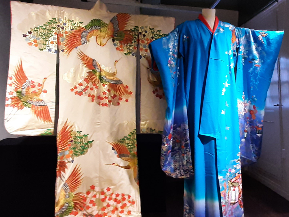 De kostbare kimono’s staan op paspoppen en hangen aan de wand door het gehele museum. Zij zijn met uiterste precisie met de hand genaaid, beschilderd en geborduurd. Elke steek en vouw in de kimono is een verhaal op zich. Patronen op de kimono weerspiegelen niet alleen de seizoenen, maar kunnen ook verborgen boodschappen bevatten over de status en zelfs de aspiraties van de drager. Zij werden veelal maar éénmaal gedragen. De bruidskimono’s zijn kleurrijk. Evenals de kinderkimono’s. Bijzonder zijn de ‘herenkimonojasjes’. Aan de buitenkant effen, aan de binnenkant is een ware familiegeschiedenis geschilderd.