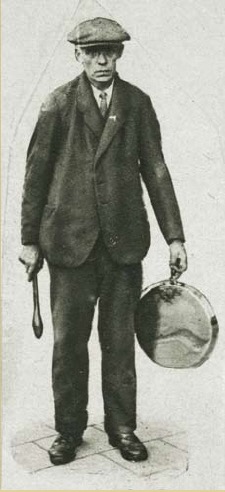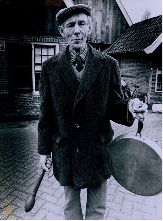1. De originele pan met stok wordt bewaard in het Bussemakerhuis. 2. Kijkje in de klokkentoren oude NH kerk, bergplaats van drie majestueuze klokken. 3. Dorpsomroeper Antoon Mulder, ‘Knip’n Toon’. 4. Gelegenheidsomroeper de heer Ardesch