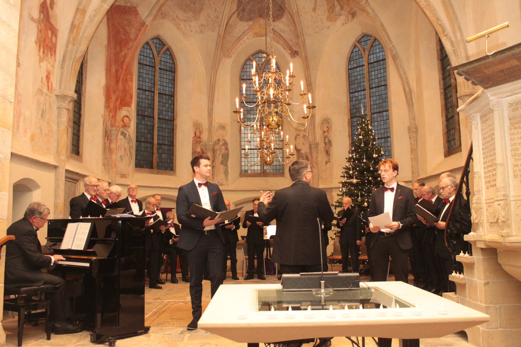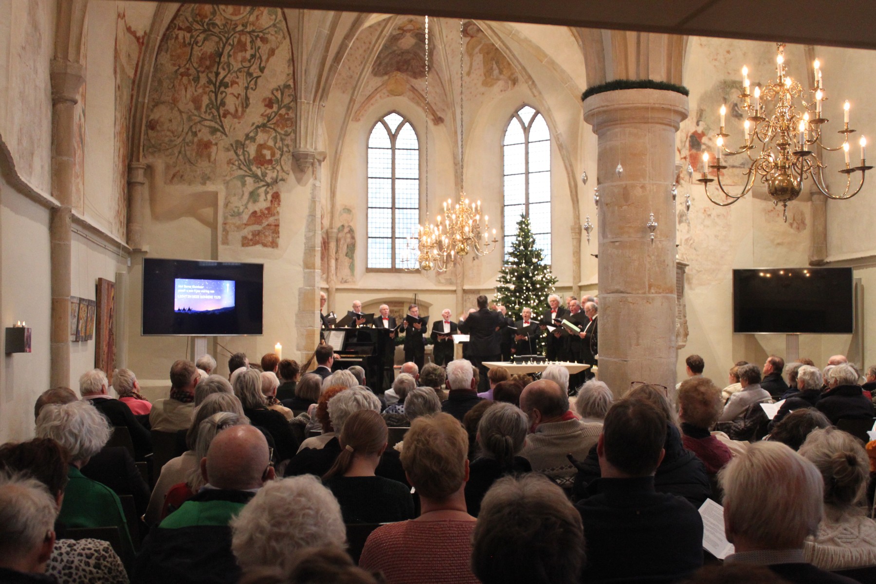 Het is een met zorg uitgezocht repertoire met een diepere betekenis. De dirigent Bram van der Beek legt uit. “In deze roerige tijd hopen we dat dit concert weer nieuwe hoop en troost geeft. Een wereld waarin liefde en respect voor elkaar de boventoon viert.” In de muziek komen allerlei facetten van Kerstmis aan de orde; de komst van Christus, de gezelligheid, genieten met elkaar en het verheugen op de glimlach van elkaar. Het concert begon met rustige liederen zoals ‘Gesegnete Nacht’ van componist Lothar Hensel. In het bijzonder uitgebreide programmaboekje werd het publiek geïnstrueerd in de diepere betekenis van de composities. Het was een repertoire met verrassingen. Eén van de koorleden speelde een oud Frans kerstlied uit de 18e eeuw solo op accordeon. Het koor liet ook horen dat zij zonder de professionele piano begeleiding van Jos Beunders a capella konden zingen. De beweeglijke dirigent, van der Beek, zorgde voor de bekwame begeleiding.