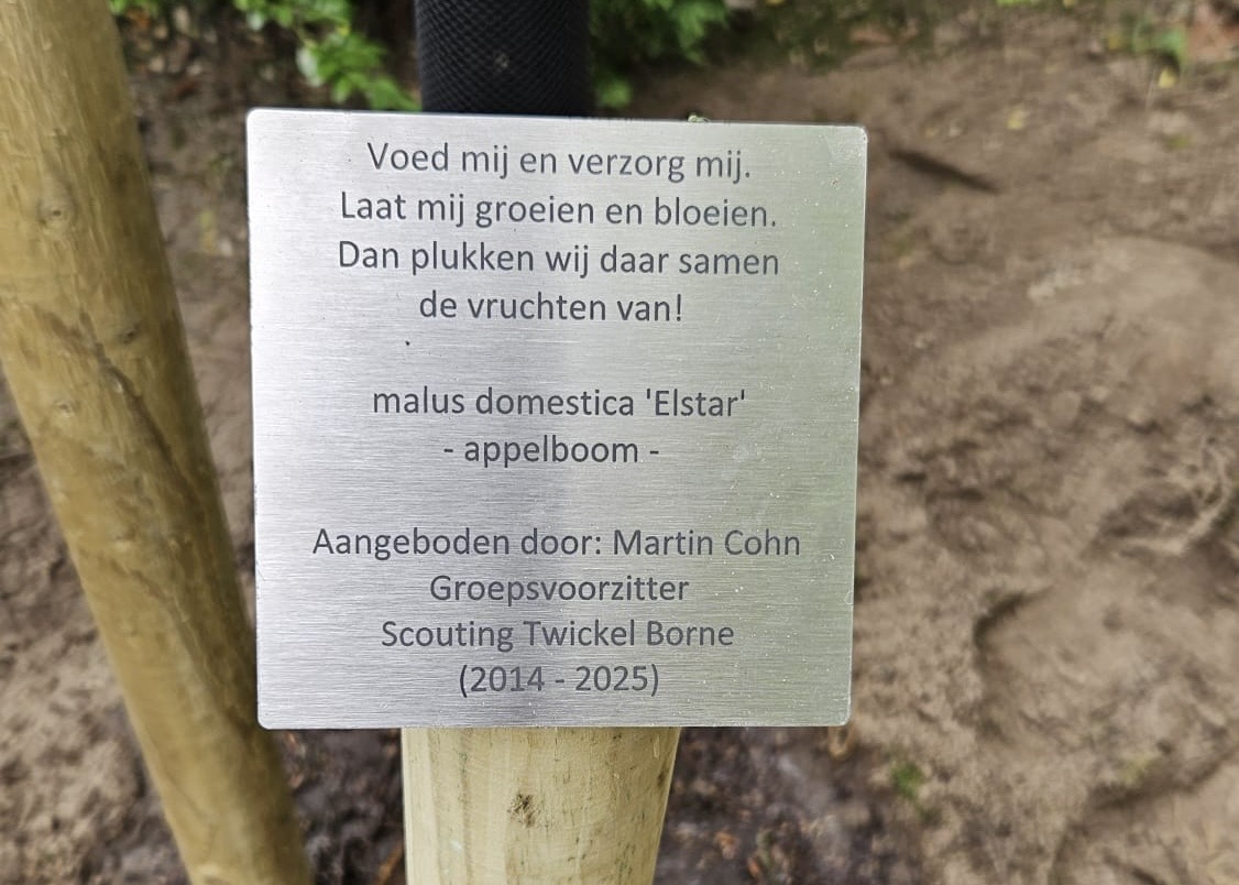 Als afscheidscadeau liet Martin een appelboom planten op het terrein, een symbolisch gebaar. “Op het bordje staat: ‘Voed mij en verzorg mij, laat mij groeien en bloeien. Dan plukken we daar samen de vruchten van.’ Dat is precies wat scouting is. Kinderen komen hier binnen, leren samenwerken, ontwikkelen hun talenten, en worden uiteindelijk zelf weer leiding. Zo is het cirkeltje rond.”