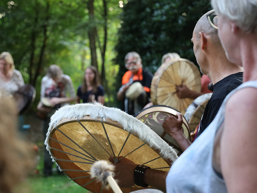 In sjamanistische tradities wordt drummen gezien als een manier om in een meditatieve of trance-achtige staat te komen. “Een sjamaan kan in die staat ‘op reis’ gaan in de spirituele wereld,” legt Paul uit. Hij werkt als ademcoach; Sylvia is opgeleid als integraal klankwerker en geeft onder meer cacao-ceremonies, soundhealings en sjamanistische massages. Volgens haar werkt trilling helend: “Omdat mensen voor zo’n 70 procent uit water bestaan, resoneert het direct in het lichaam.” Soms komen daardoor emoties of herinneringen los. “Een vrouw zei na afloop: ‘Dankjewel dat ik hier al mijn ballast mocht achterlaten.’ Dat is waar we het voor doen.”