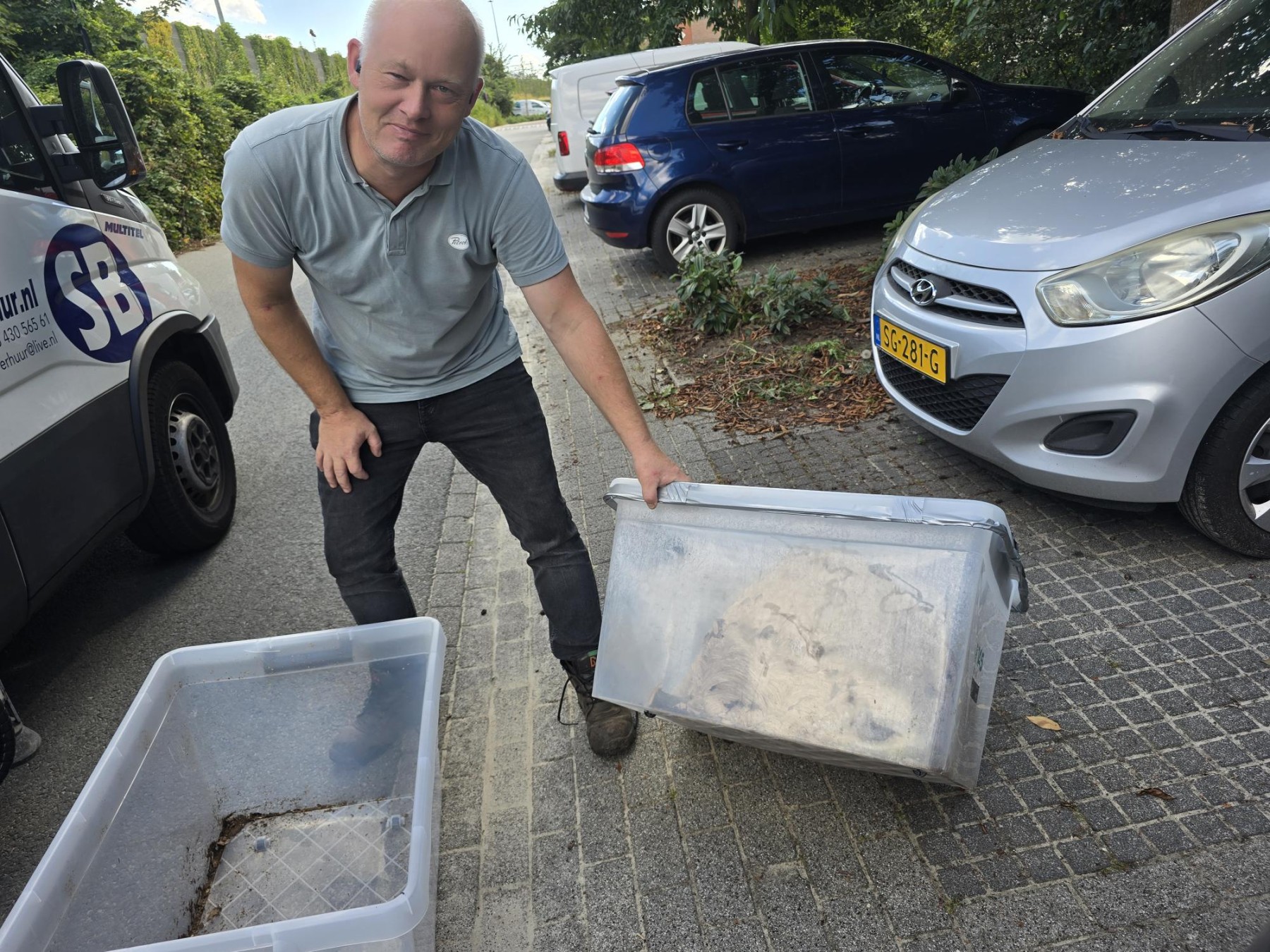 Gespecialiseerd bestrijder Richard Knol werd ingeschakeld en verwijderde het nest vakkundig. “Het wordt eerst ingespoten met een speciaal schuim en de hoornaars worden opgezogen. Vervolgens wordt het nest in een doorzichtige bak geplaatst – in dit geval een hele grote! Op de plek van het nest wordt een pot met lokstof gezet, waar de hoornaars die op dat moment nog onderweg zijn, bij terugkomst in verdwijnen.” Nest en opgezogen insecten gaan daarna in speciale vrieskisten. “Pas dan zijn ze dood.”