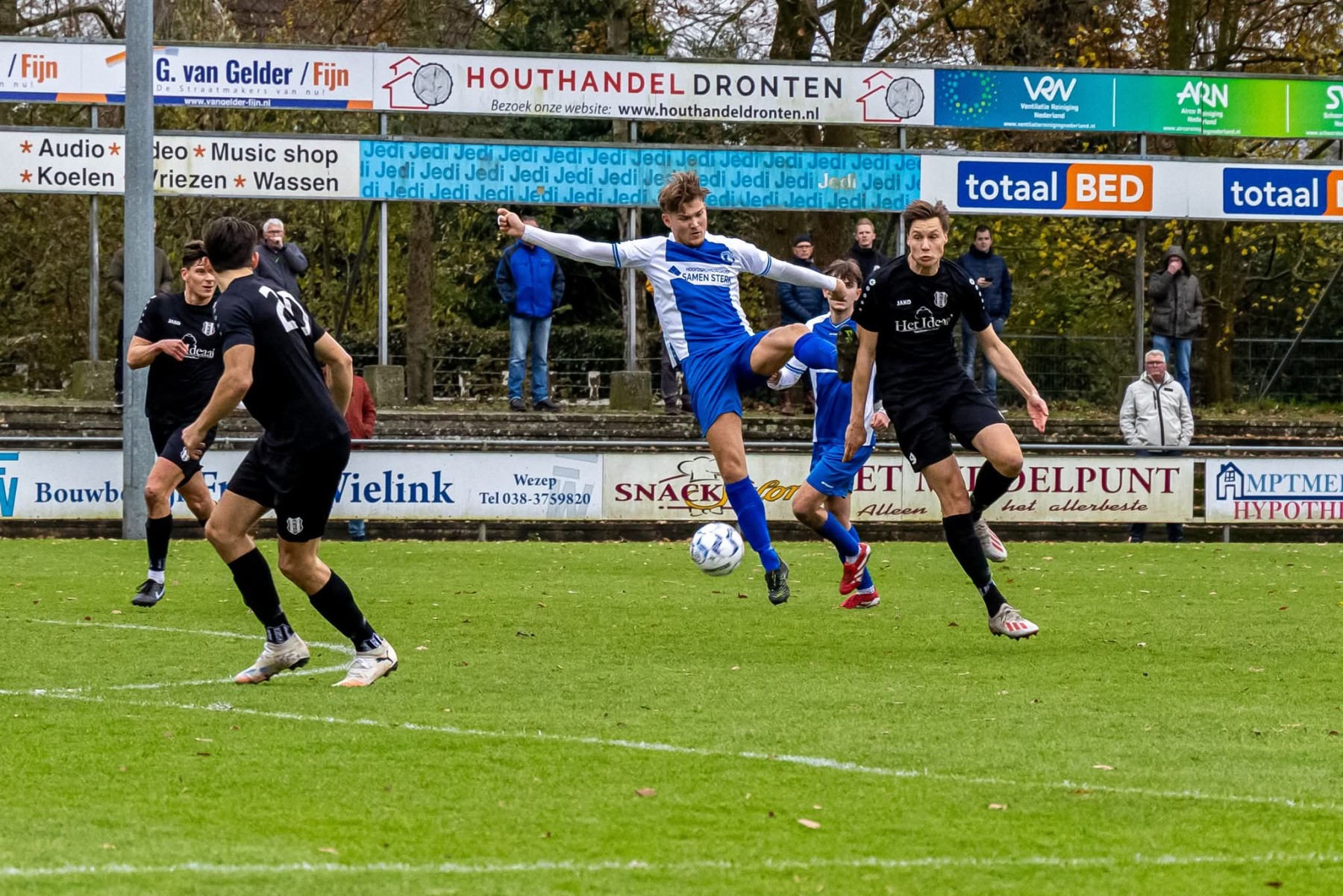 Een terechte overwinning van NEO derhalve, de eerste op natuurgras sinds mensenheugenis. En zoals al vaker gememoreerd, in de vierde divisie D kan iedereen van iedereen winnen. Van de topploegen wonnen alleen NEO, Heino en SVZW, de rest verspeelde punten, waardoor NEO ineens weer fier bovenaan staat, een ongekende positie.