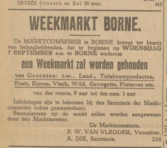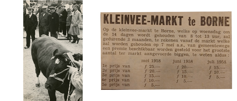 Borne en de markt, het klinkt als een vanzelfsprekende combinatie, een ontmoetingsplek waar handel sfeer en beleving samenkomen. Toch heeft het, anders dan bij onze buren, tot 1955 geduurd, voordat er een structurele wekelijkse marktdag in ons dorp van de grond kwam. Pogingen in 1873, 1915 en 1927 om een wekelijkse warenmarkt in het leven te roepen, liepen op niets uit. Hoe kwam dat?