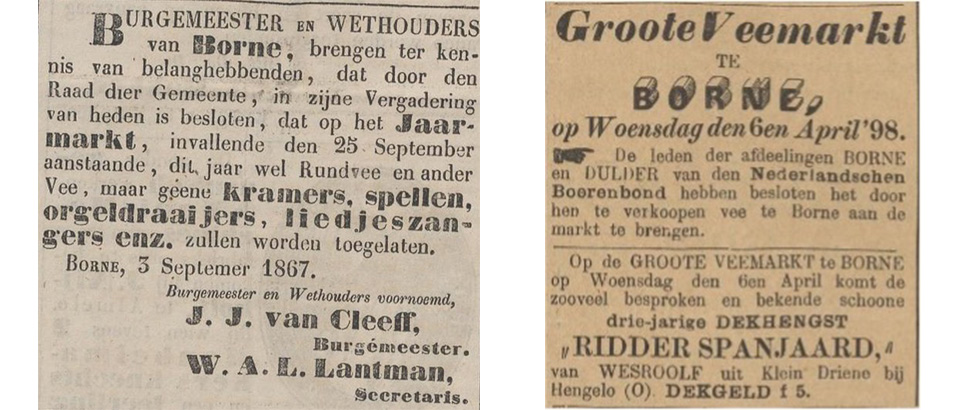 In Borne werden in de 19e eeuw regelmatig traditionele beesten- en veemarkten gehouden, sterk verbonden met het agrarische karakter van het dorp, gericht op vee, landbouwproducten en rondreizende handel. De markten trokken veel boeren, veehandelaren en marskramers. Daarnaast, kende de gemeente 12 marktdagen per jaar, zo staat te lezen in een brief van burgmeester Lantman aan de controleur der belastingen in Enschede, gedateerd 6 augustus 1834; “dat in mijne gemeente twaalf marktdagen in het jaar bestaan, waarvan er elf moeten geconsidereerd worden als weekmarkten”. In september werd er een jaarmarkt gehouden die “met de naam kermis wordt bestempeld”, aldus de burgemeester.