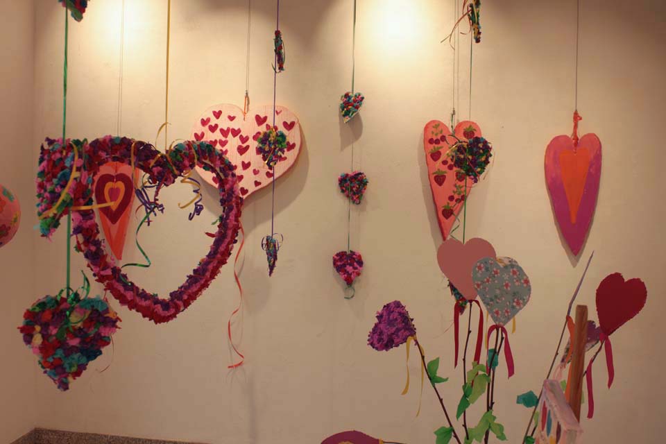 Het hart roept bij iedereen emoties op. Stijn heeft een hartvormige ballon beplakt met roze gedecoreerd papier. De eerste was zo mooi dat hij die met liefde cadeau deed aan zijn zus. Nu hangt er weer een nieuwe in de openbare galerie, ook met veel liefde gemaakt.