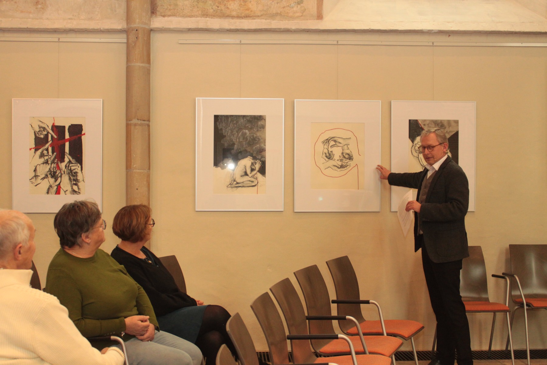 Ds. Johan Meijer opende op een regenachtige zondag de expositie ‘Een diepe voor in de aarde’ in de Oude Kerk. “De klassieke opbouw van de kruiswegstaties, halteplaatsen voor bezinning, stamt uit 1751”, legt Meijer uit. Het is de volgorde waarin de lijdensweg van Christus wordt verbeeld: van het paleis van Pontius Pilatus tot en met de begrafenis.