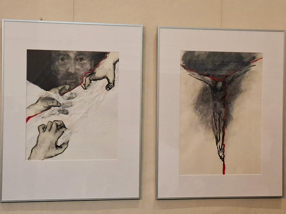 Aanleiding voor de serie was een eerdere kruisweg op de Lochemse Berg. “Na afloop maakte ik een volledige kruiswegserie op papier, in zwart-wit, met houtskool en een enkel rood accent – rood als kleur van lijden én liefde. Niet om het verhaal van één mens opnieuw te vertellen, maar om het universele menselijke lijden te tonen: kwetsbaarheid, weerloosheid en het besef dat niet alles maakbaar is. Veel lijden blijft verborgen. Het kan dichtbij zijn, in je eigen huis.” Persoonlijk verdriet vond zijn weg in het werk. Zo toont de vierde statie – Jezus ontmoet zijn moeder – handen en een baarmoeder: een ode aan zorg, verbondenheid en de kringloop van geboorte en sterven. In dit werk zijn papier, houtskool en textiel verwerkt. Ds. Meijer stelt deze vierde statie centraal tijdens zijn afscheidsdienst op 8 maart.