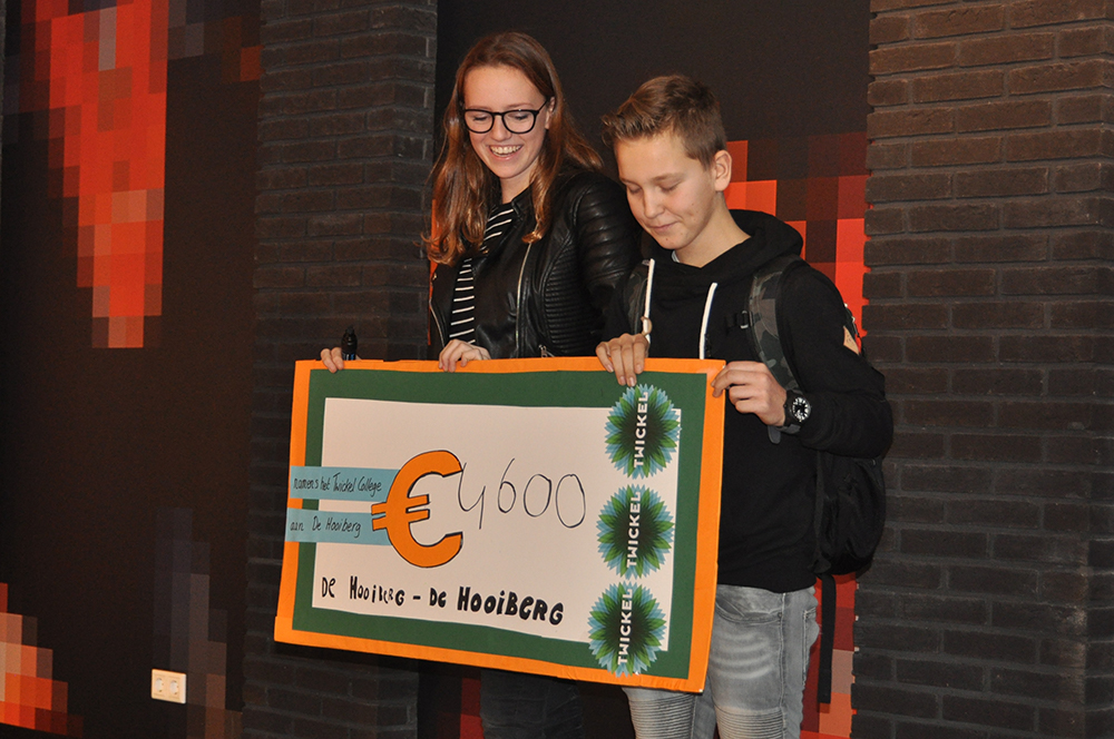 Aan leerlingen Marit Volder en Vigo Platenkamp (foto rechts) de eer om de cheque in een vol atrium van de middelbare school aan te bieden. Zij haalden het meeste geld op. Marit zorgde voor 110 euro in de pot en Vigo spande de kroon met 115 euro. Ze staan beiden helemaal achter het goede doel dat dit jaar aan de kerstactie was gekoppeld. “Ook deze mensen moeten gewoon een goed huis hebben”, vindt Marit. “En goede hulp”, voegt Vigo er aan toe. “Hiermee kunnen ze het allemaal extra mooi maken.”
