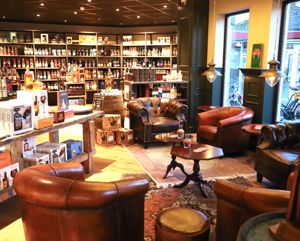 Vol trots geeft Hilderink dinsdagmiddag de genodigden een kijkje in zijn nieuwe winkel. “Alleen de winkelruimte al is ruim drie keer zo groot als aan de Azelosestraat, waar we ruim 21 jaar zaten”, zegt hij. “In deze grote ruimte komen drie werelden samen: die van bier, wijn en gedistilleerd. Elk met hun eigen uitstraling en sfeer.” De oude bar van de Azelosestraat heeft opnieuw een plekje gevonden in de nieuwe wereld van het bier, waarin nu het dubbele aantal biermerken zijn samengebracht. De wijnwereld oogt mediterraans met een bijzondere tegelvloer, terwijl er ook in de gedistilleerde hoek een gezellige bar is geplaatst, evenals oude leren fauteuils en zo meer. “Een heel mooie plek om lekkere whisky te proeven”, aldus de slijter.