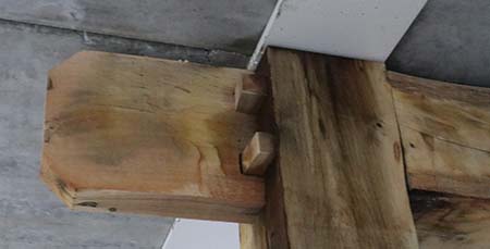 De bedoeling was om de originele gebinten uit de gesloopte boerderij die rechts van de nieuwbouw stond opnieuw te gebruiken. Die waren jammer genoeg door de tand des tijds en ongedierte dermate verzwakt dat dat niet ging. Bovendien voldoet de nieuwbouw aan de eisen van deze tijd en zijn de oorspronkelijk houten vloeren nu van beton en dus zwaarder… Overigens moest het ontwerp natuurlijk aan de huidige eisen van bouwen voldoen. Dus zaken als betonnen vloeren en isolatie zijn nu conform die eisen geconstrueerd. De oude gebinten zijn daarom nauwkeurig nagemaakt van eikenhout en met de originele verbindingen als pen/gat gemonteerd.