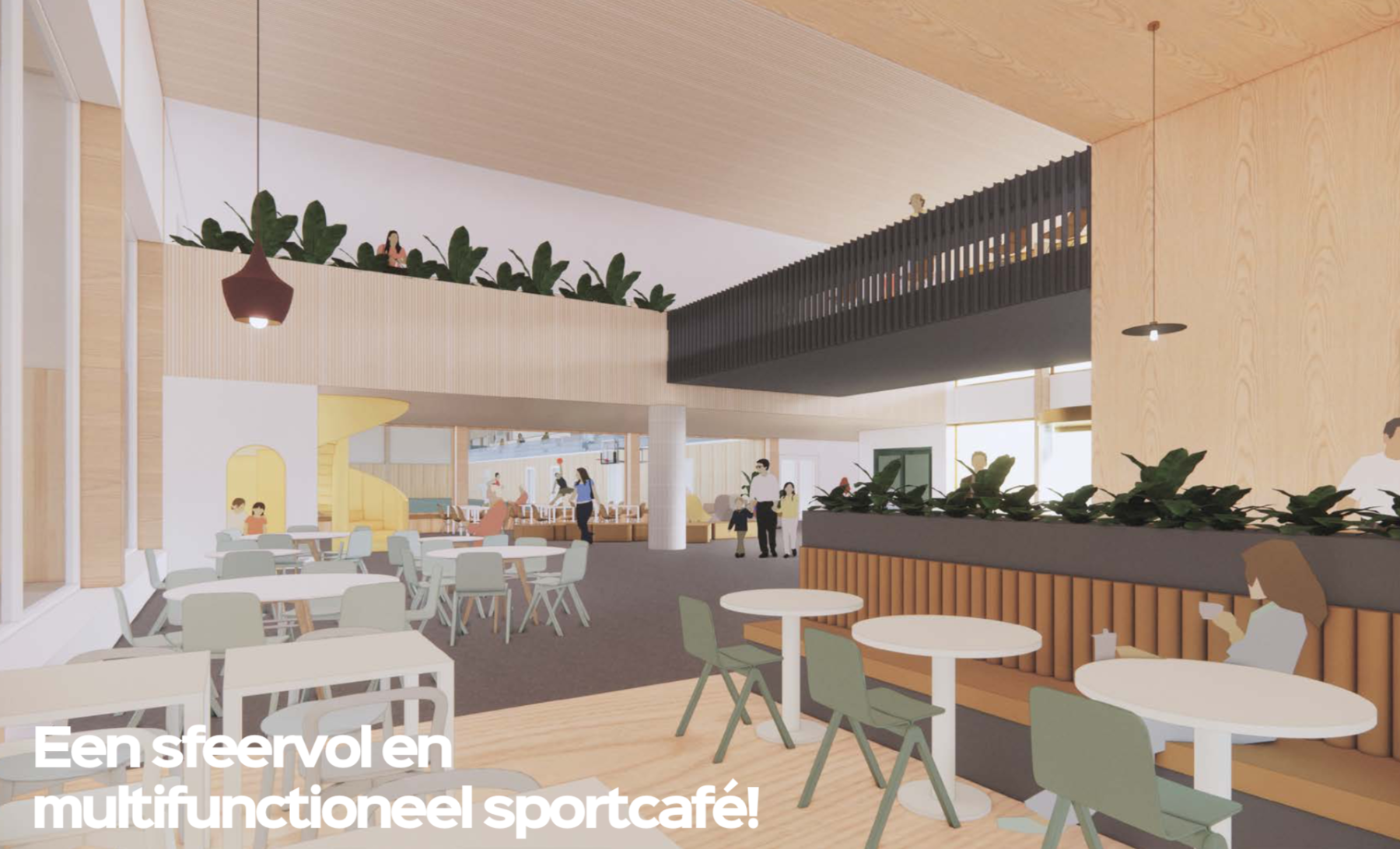 Verder valt op dat er veel aandacht is voor zichtlijnen. Van binnen naar buiten en van buiten naar binnen. Koenis: “We trekken het open.” Het idee is dat er een parkachtige plein ontstaat tussen zwembad en sporthal, maar ook dat er verbinding is met de sportfaciliteiten van het hele sportpark ’t Wooldrik. Het hart van het sportcomplex wordt de entree en ontmoetingsruimte. Op de eerste verdieping is er eveneens gelegenheid voor sporters om elkaar te ontmoeten en zicht te hebben op het sporten in de hal. Ook op de eerste verdieping ruimte voor fysiotherapie, een krachthonk en een dans/vechtsportzaal.